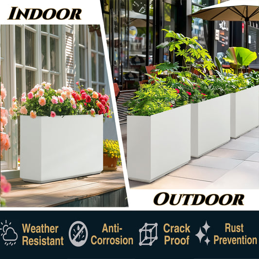 Our large white planter is proudly crafted from high-grade metal and special outdoor baking paint, which makes it resistant to cracks, fading, and UV. It allows it to withstand extreme temperatures ranging from -20 to +120 degrees.