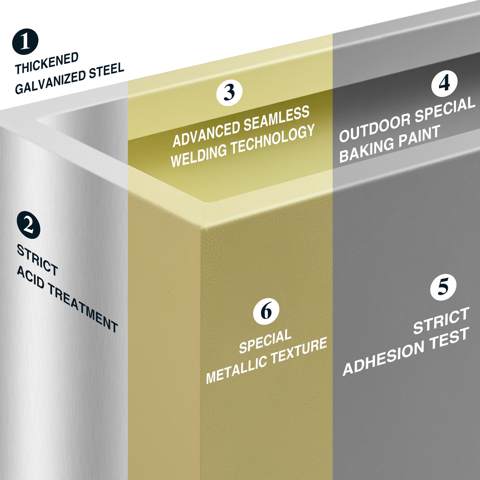 - METALLIC HEAVY PLANT BOX: Made from galvanized steel & outdoor paint, this planter box features a premium metallic color & texture from the powder injection process.