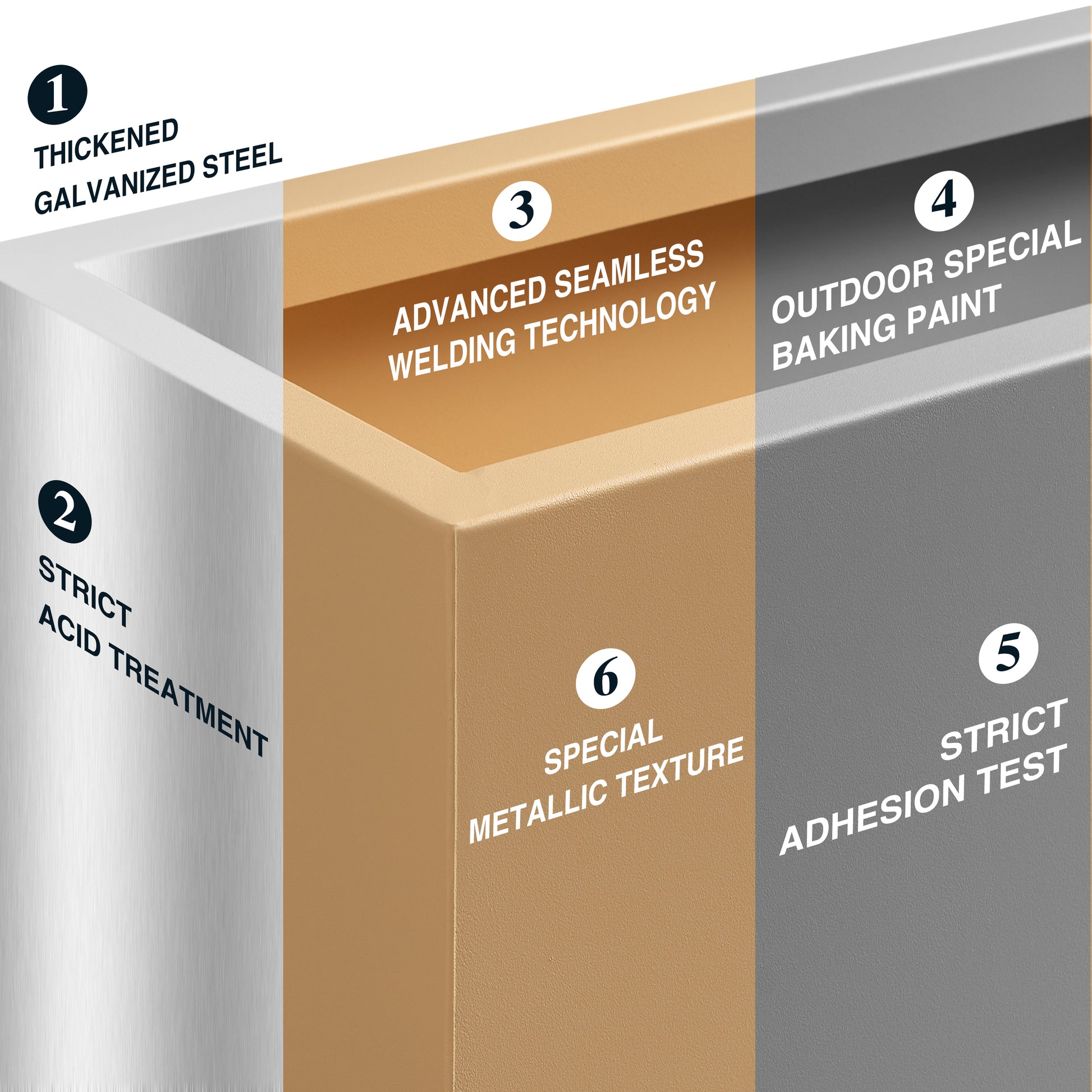 - METALLIC HEAVY PLANT BOX: Made from galvanized steel & outdoor paint, this planter box features a premium metallic color & texture from the powder injection process.