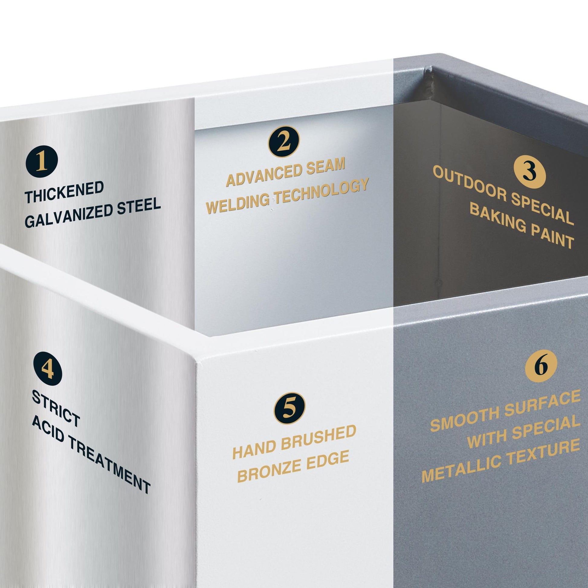 - SQUARE PLANTER: Seam-welded, thick galvanized steel with outdoor special baking paint; powder injection process gives it a premium metal finish and texture. No assembly necessary.