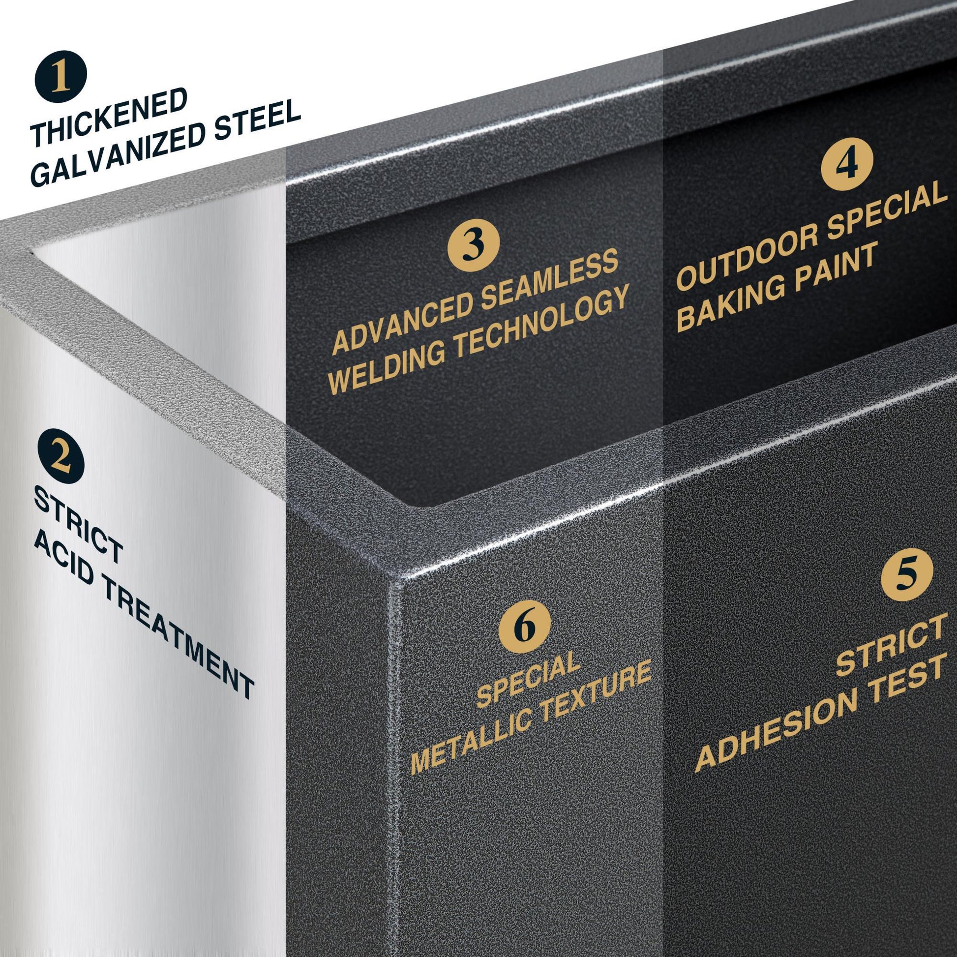 - METAL PLANT BOX: This planter box is made from a fully seam welded thick galvanized steel, and adopts outdoor special baking paint, giving the surface a premium metallic color and special texture through advanced powder injection process.